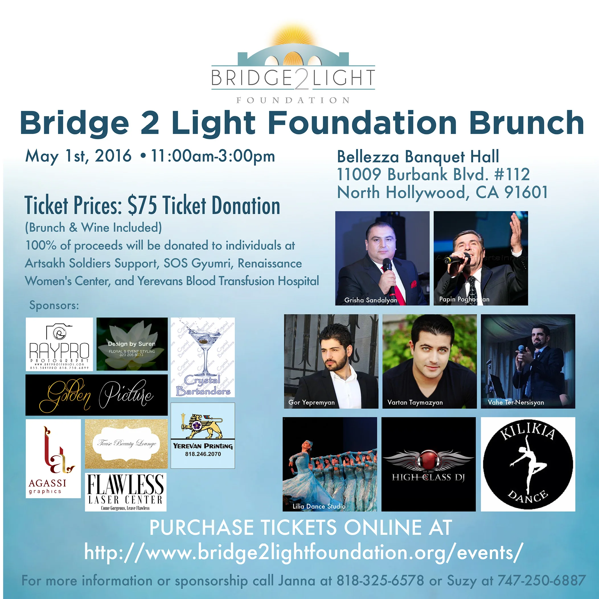 Bridge2Light Foundations first event will be held on May 1, 2016 at 11am. at Belleza Banquet Hall. We will be joined by singers, dance groups, actors/actresses, and hosts. The event itself will be hosted by Grisha Sandalyan. Everyone is welcome but seats are limited. Tickets will be available in the form of donations at $75 per person. The event will be entirely filmed and broadcasted in Armenia and the United States. It will premiere on more than 10 blogs. The monetary funds will be personally delivered to the families in Armenia by the Founder and Co-Founder of Bridge2Light Foundation and the International Liaison Diana Grigoryan in July of 2016.